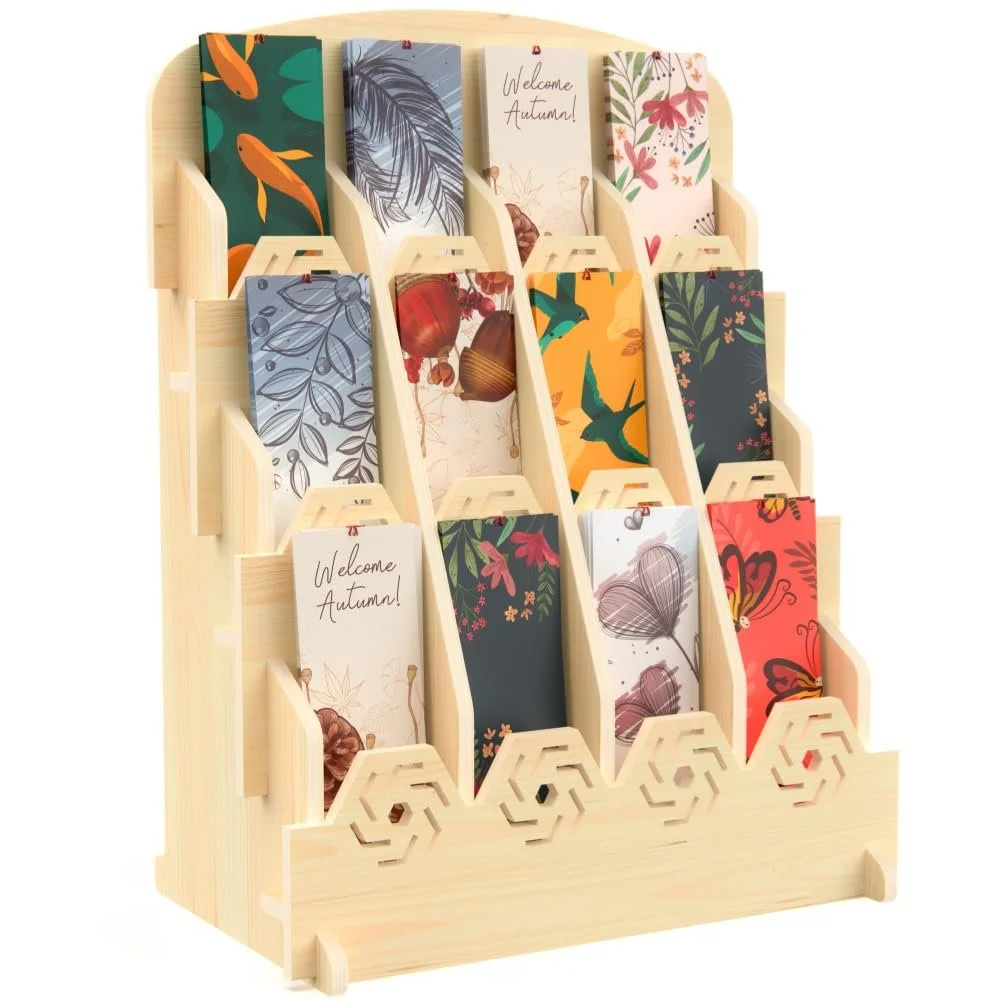 Add a slim rack at the end of a high-traffic shelf or bookcase. Position it where customers are already browsing so it feels integrated, not separate. Small paper goods perform best when they live alongside books, not away from them.