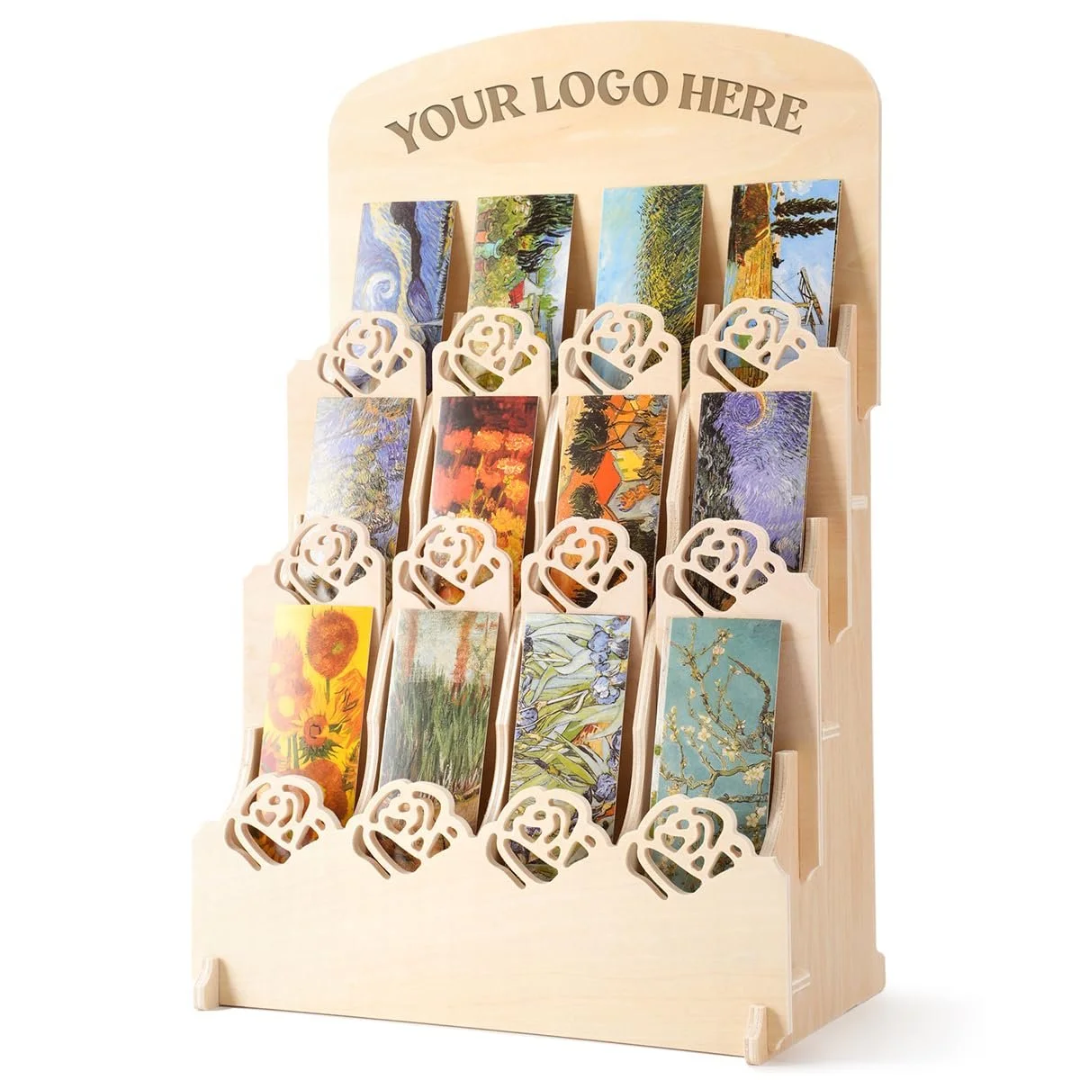 Make sure the full artwork is visible instead of just the top edge. Arrange designs evenly and keep the rack tidy so customers can scan quickly. The easier it is to see and compare, the more likely they are to grab one.